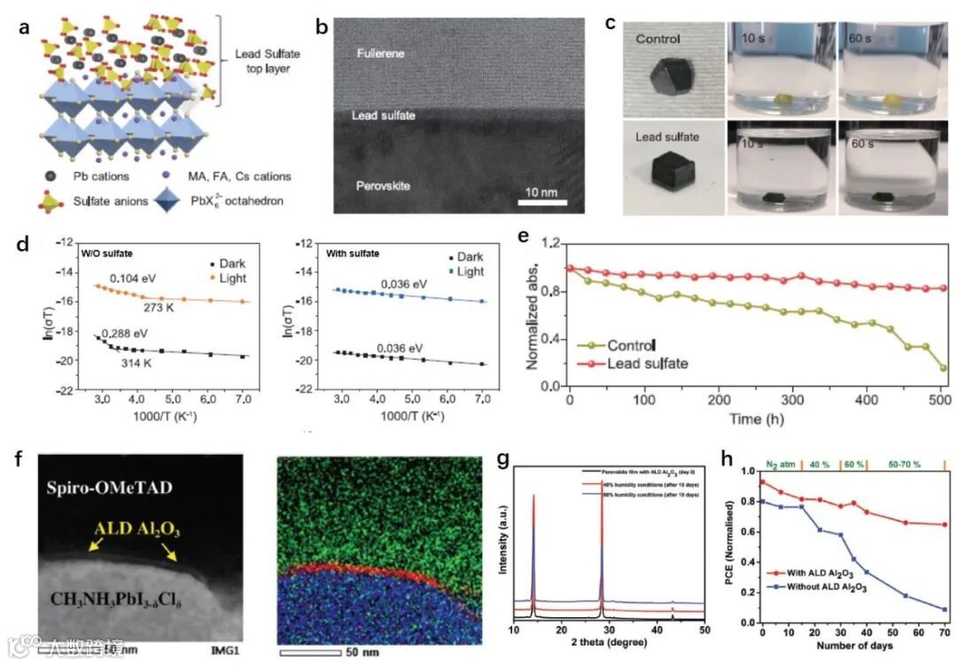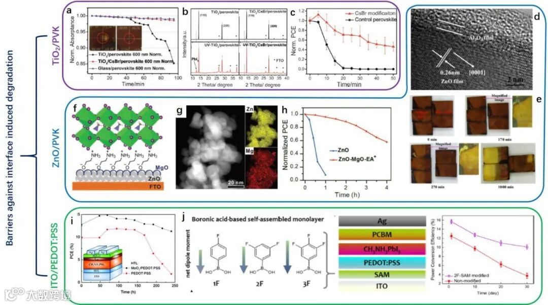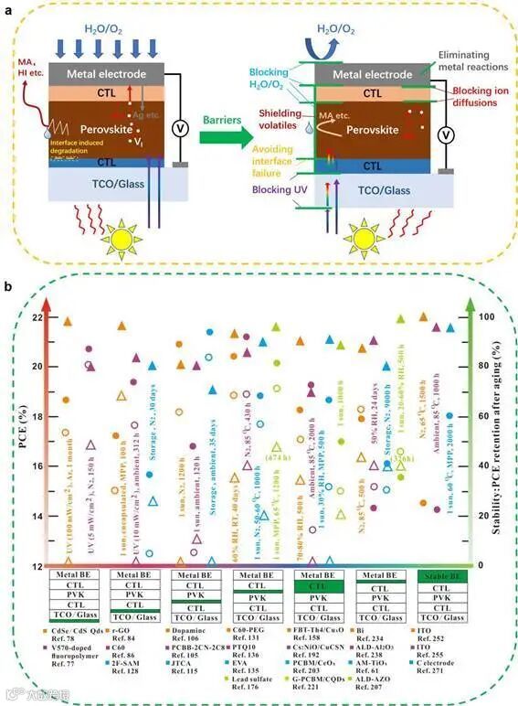 图3示例了界面阻挡层对器件界面稳定性的提高作用。这些界面阻挡层不仅防止了反应性功能层的直接接触,而且还改善了界面性能,促进电荷提取,减少复合,从而可以同时提高效率和稳定性。