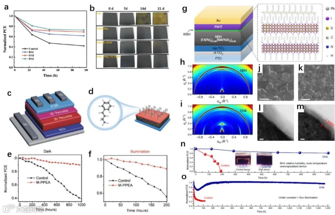 图6示例了2D钙钛矿层作为阻挡层显著的湿度和光照稳定性。当在钙钛矿晶格中掺入较大的有机“ A”阳离子时,会形成二维钙钛矿,其中较大的“ A”位阳离子插入层状PbX6八面体中,导致异向结构和减小的表面能。由于“ A”阳离子的疏水性和诱导的表面能,以及界面处的缺陷钝化作用,加入2D钙钛矿阻挡层可以获得改善的水分和光热稳定性。