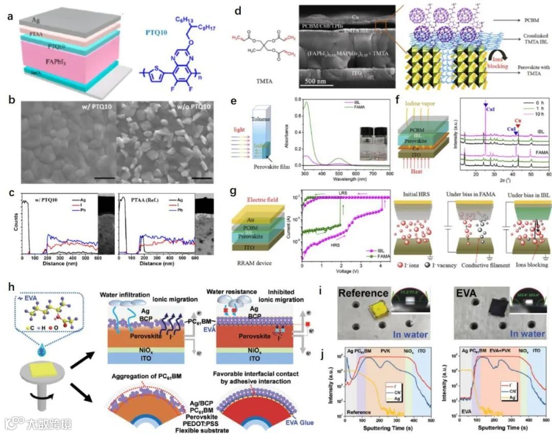 图4. 钙钛矿上层有机阻挡层抵抗水氧攻击和离子迁移。