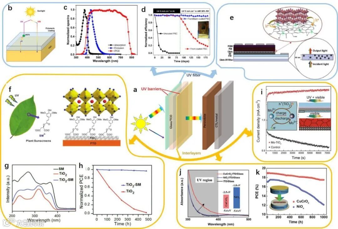 图2示例了各种UV光阻挡层及其对器件UV光稳定性的大幅提高。UV光阻挡层通常位于TCO玻璃基板外侧或作为TCO和钙钛矿吸收层之间的中间层,采用在紫外区域具有强吸收峰,或能将UV光转换为可见光的材料体系,以减少钙钛矿层对UV光的吸收,提高器件的UV光稳定性。
