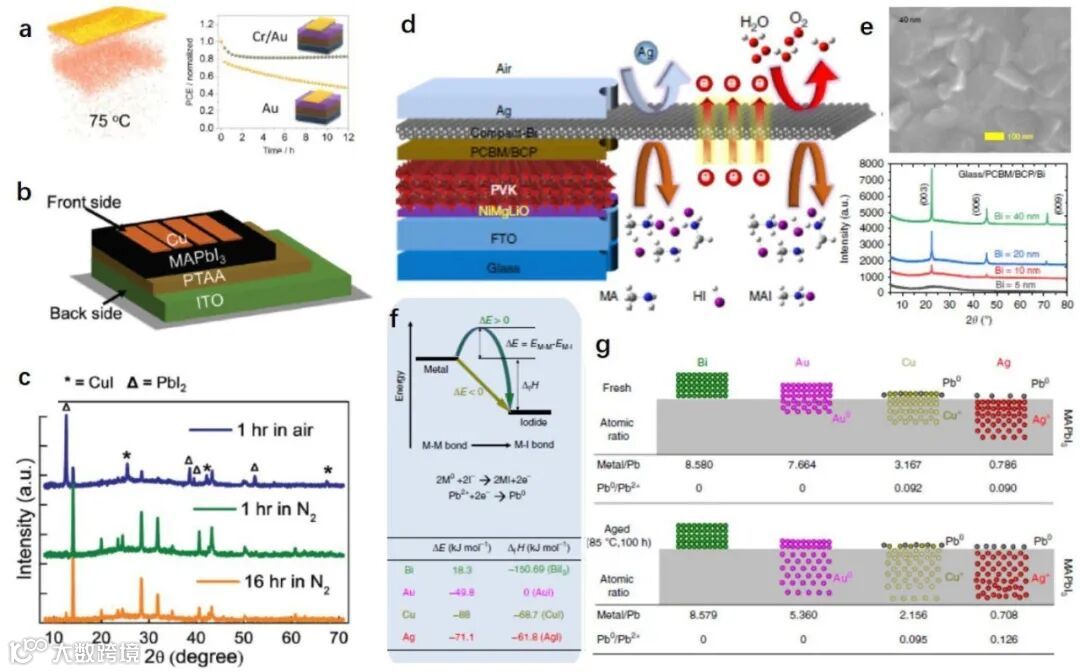 图7(g)展示了钙钛矿/5 nm 金属膜在85℃老化后表面XPS原子比,结果证明,Au,Cu,Ag等金属向钙钛矿扩散严重,而稳定的Bi金属不会向内扩散。