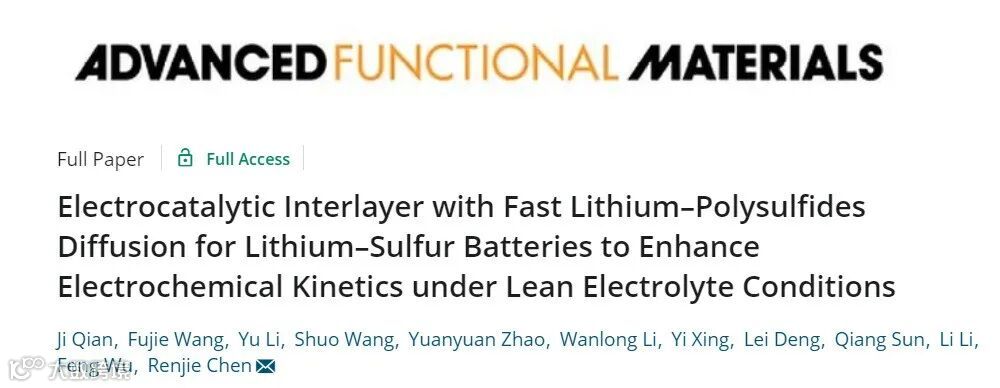 锂硫电池具有较高的理论能量密度,是一种很有前途的储能装置。对于实用的锂-硫电池,减少电解液的用量是实现高能量密度的关键。然而,降低电解液量会导致严重的性能下降,主要是因为放电产物(Li2S)沉积迟缓以及Li2S绝缘性引起的钝化问题。针对上述现象,北京理工大学、北京电动车辆协同创新中心的陈人杰教授等人在国际知名期刊Advanced Functional Materials上发表题为“Electrocatalytic Interlayer with Fast Lithium–Polysulfides Diffusion for Lithium–Sulfur Batteries to Enhance Electrochemical Kinetics under Lean Electrolyte Conditions”的文章。本文第一作者是Ji Qian。本文采用三维开放结构和低比表面积设计制作,这种结构有助于电解质渗透,而不会捕获过多的电解质。此外,电催化Co纳米粒子嵌入层间骨架表面,有效地促进了Li离子的扩散、多硫化物的转化和Li2S的沉积,从而提高了贫电解质条件下的电化学动力学。通过微观结构表征、电化学性能测试、密度泛函理论计算和原位X射线衍射表征,研究了层间效应的机理。这些结果表明,在贫电解质条件下,采用层间策略改善锂硫电池的电化学性能,有可能提高锂硫电池的实际能量密度。