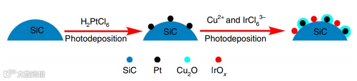 因此,作者开发了在SiC表面负载光氧化单元(IrOx)和光还原单元(Cu2O-Pt)制备Cu2O-Pt/SiC/IrOx复合光催化剂的方法。这种结构可以提高光生电荷的寿命和CO2的吸附,从而提高光催化效率。此外,作者构建了一个由两个反应室组成的空间分离的反应系统,类似于自然光合系统。一个腔室装有Cu2O-Pt/SiC/IrOx光催化剂和Fe2+用于CO2还原,而另一个腔室装有已知的Pt/WO3和Fe3+用于H2O氧化,两个腔室被Nafion膜隔开,允许Fe2+和Fe3+离子渗透。