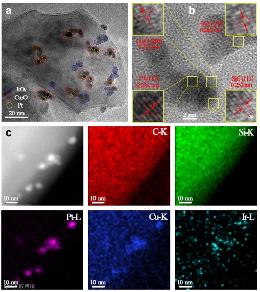 (a)TEM, (b)HRTEM images and (c) STEM image and corresponding EDS mapping profiles for C-K, Si-K, Pt-L, Cu-K and Ir-L of Cu2O–Pt/SiC/IrOx.