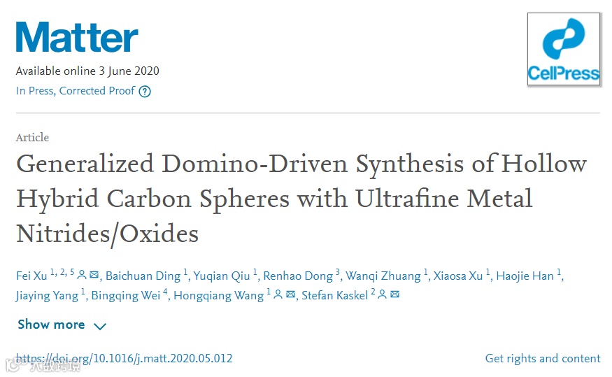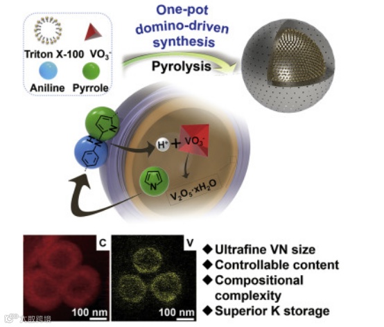 本文报道了基于多米诺骨牌效应驱动的一步水溶液组装合成超小金属氮化物/氧化物颗粒封装的空心球复合材料,具体涉及有机单体胶束界面共聚合形成空心壳层,以及其释放出的质子原位诱导含氧金属盐在腔内缩合沉淀实现封装,随后高温热解转化为相应的空心碳复合材料。