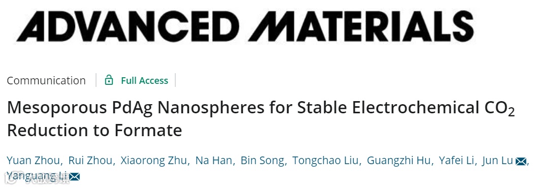 文章链接:Mesoporous PdAg nanospheres for stable electrochemical CO2 reduction to formatehttps://onlinelibrary.wiley.com/doi/10.1002/adma.202000992 作者简介: 李彦光 教授李彦光,教授,博士生导师。2005年本科毕业于复旦大学,2010年博士毕业于美国俄亥俄州立大学化学系。2010-2013年在美国斯坦福大学从事博士后研究,2013年加入苏州大学功能纳米与软物质研究院工作至今。李教授的主要研究方向是高效能量转换的无机纳米功能材料, 围绕无机纳米功能材料的控制制备及其在光-电-化学能相互转换中的应用探索开展工作,重点发展它们在电催化、光催化和电池储能等前沿领域的应用。到目前为止,已在Nature Communications, Chem, PNAS, EES, Angewandte Chemie, Advanced Materials等国际期刊上发表论文110多篇,论文总他引27000余次。获中国化学会青年化学奖、中国电化学青年奖等奖项,获“青年千人计划”、基金委优秀青年基金和江苏省杰出青年基金资助,在2017-2019年连续入选美国科睿唯安“全球高被引学者”榜单。陆俊 教授陆俊,美国阿贡国家实验室化学家。2000年在中国科学技术大学获得物理化学专业学士学位,2009在犹他大学冶金工程系获得博士学位,博士期间研究的方向是金属氢化物在可逆储氢方面的应用。目前主要研究方向是:电化学能源储存与转化。科研兴趣涉及电化学能源存储及转换等领域。研究内容主要是锂离子电池和金属锂电池方面,如对开放式锂空气电池和闭合式锂空气电池的研究,锂离子电池中高能量密度正极材料的设计,锂硫电池中高能量密度正极材料,固态电解液及阴极材料的研究,钠离子电池和钠空气电池中的材料及电池形态的设计。在Nature, Nature Energy, Nature Nanotechnology, Chem. Rev., JACS, Nature Commun., Energy and Environmental Science等权威期刊发表论文170余篇,授权专利20余项。目前工作被引超过13000次,H因子62。