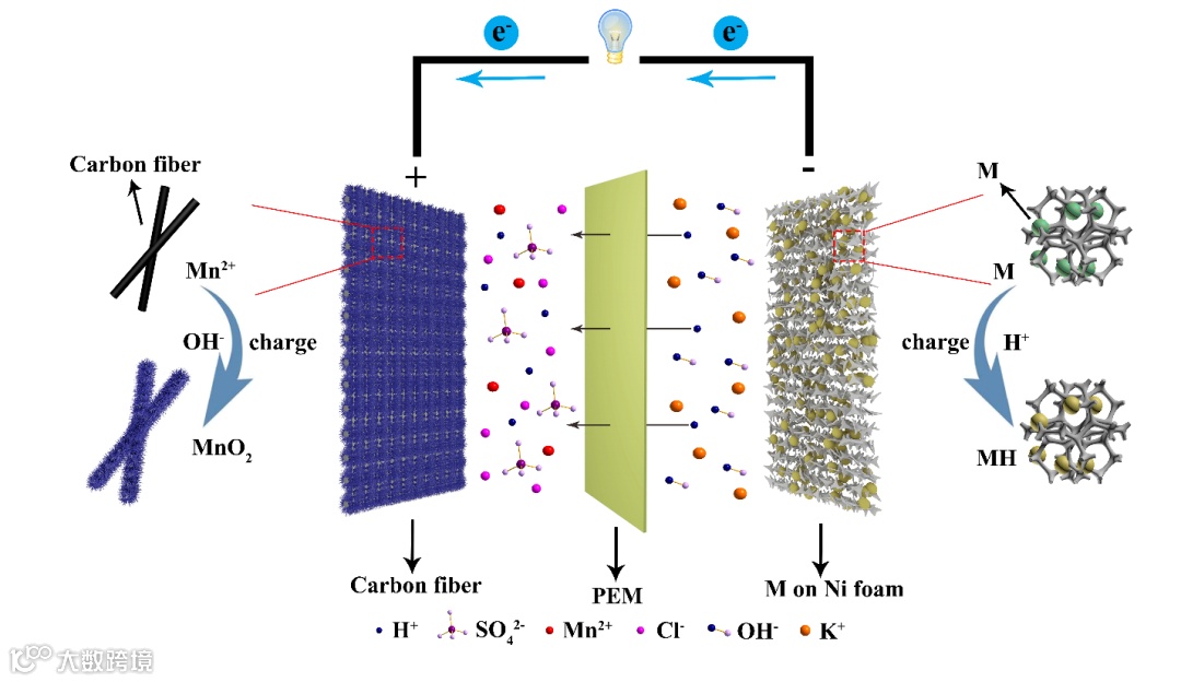 本文报道了一种高能量锰-金属氢化物(Mn-MH)混合电池,该电池的正极基于Mn2+/MnO2的沉积/溶解反应,负极基于储氢合金的吸放氢反应,两极室之间采用质子交换膜来实现H+离子的传输以及正负极室电解液的分离。