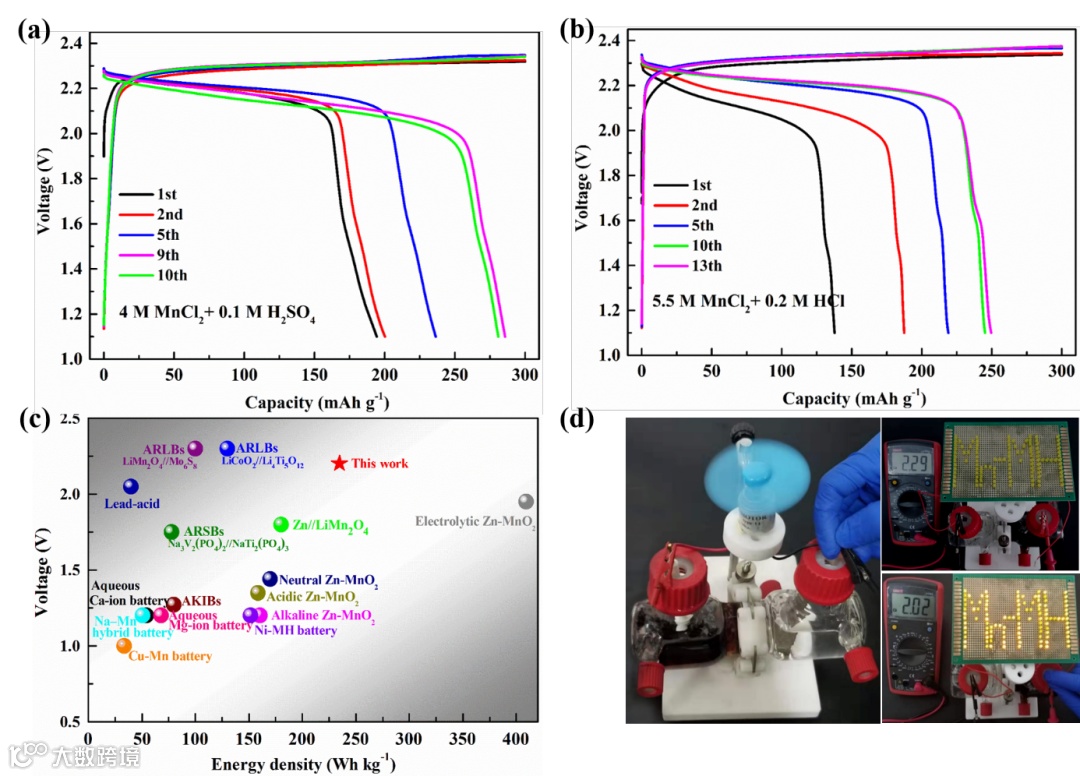 鉴于Lewis酸性的MnCl2的高比容量和在水中的高溶解度,以及MH负极的低电极电位,该水系Mn–MH混合电池具有优异的电化学性能;当采用5.5 M MnCl2为正极电解液时,可实现高达2.2 V的放电电压平台和约为240 Wh kg−1(基于正极5.5 M MnCl2溶液和负极储氢合金电极的总质量)的能量密度。此外,长循环中该混合电池没有明显的容量衰减。