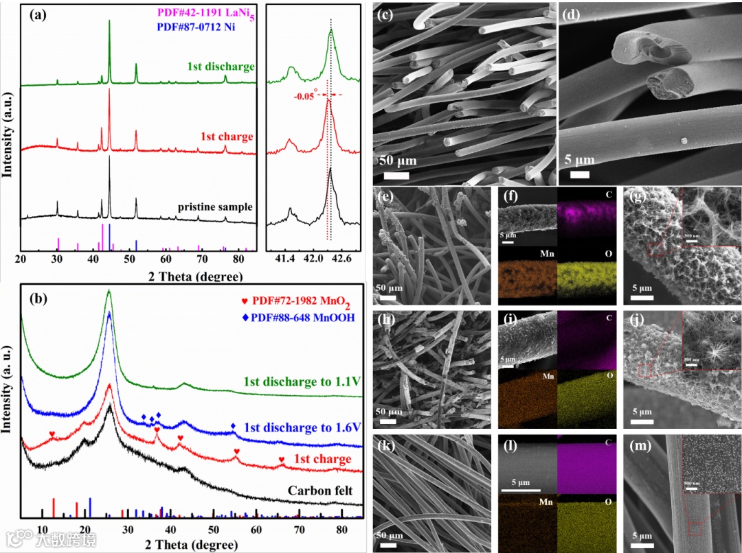 锰氧化物因其丰富的锰资源、低廉的成本,且具有多价锰离子(Mn2+、Mn3+、和 Mn4+),能够提供高反应电位的多电子反应的特性,是极具发展前景的正极材料。然而,在多数水系电化学系统中,只发生了Mn4+/Mn3+单电子反应,但由于Mn3+的歧化反应致使电极材料在循环过程中产生活性Mn的溶解,导致MnO2阴极明显的容量衰减。因此,有效利用MnO2电极的双电子反应和提升其循环稳定性是非常值得期待的。