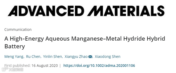 近日,南京工业大学赵相玉研究员课题组在国际顶级期刊Advanced Materials 上发表题为“A High‐Energy Aqueous Manganese–Metal Hydride Hybrid Battery”的研究工作。