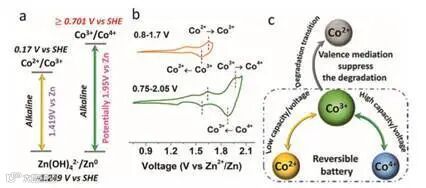 此外,一旦激活,Co3+/Co4+对就不稳定,因为它通过Co3+向Co2+的转变迅速降解。这些限制导致AZB中很少使用Co3+/Co4+。目前,大多数报道的含钴AZB正极由钴氧化物组成。通常,当与碱性电解液中的锌配合使用时,它们显示出相对较低的输出电压(1.6–1.8 V)和较短的寿命(约2000个周期)。其他正极材料,包括铜、锰和镍基氧化物或氢氧化物,在应用于AZB时也有类似的缺点。它们在寿命短(通常<2000个周期)和低输出电压(0.6–1.7 V)方面提出了重大挑战。此外,大多数潜在容量仍需要通过解码新机制来进一步实现。