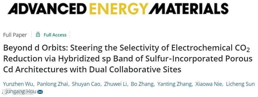 近日,大连理工大学侯军刚教授在国际期刊Advanced Energy Materials (影响因子:25.245) 上发表题为“Beyond d Orbits: Steering the Selectivity of Electrochemical CO2 Reduction via Hybridized sp Band of Sulfur‐Incorporated Porous Cd Architectures with Dual Collaborative Sites”的研究工作。