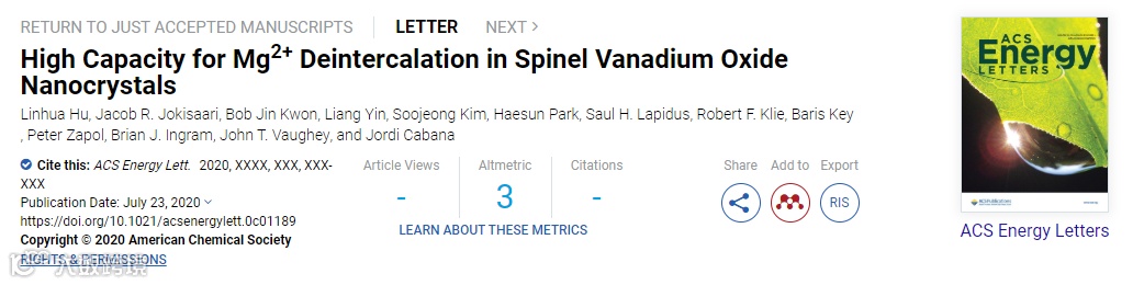 近日,美国伊利诺伊大学芝加哥分校Jordi Cabana课题组在国际顶级期刊ACS Energy Letters (影响因子:16.331) 上发表题为“High Capacity for Mg2+ Deintercalation in Spinel Vanadium Oxide Nanocrystals”的研究工作。