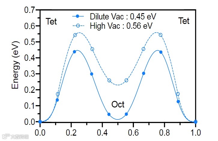 图1. 尖晶石V2O4框架中四面体之间Mg迁移的最小能量路径
