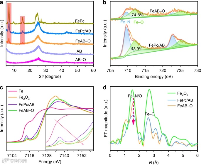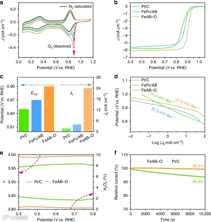 X射线吸附实验和O2吸附/解吸实验分别证实了FeAB-O催化剂的轴向O配位和优异的O2吸附能力。ORR性能测试表明,优化后的FeAB–O催化剂具有27.5 mV dec−1的超低Tafel斜率和0.90 V的半波电位,比而无轴向O配位的Fe/AB高30mV,比Pt/C高50 mV。