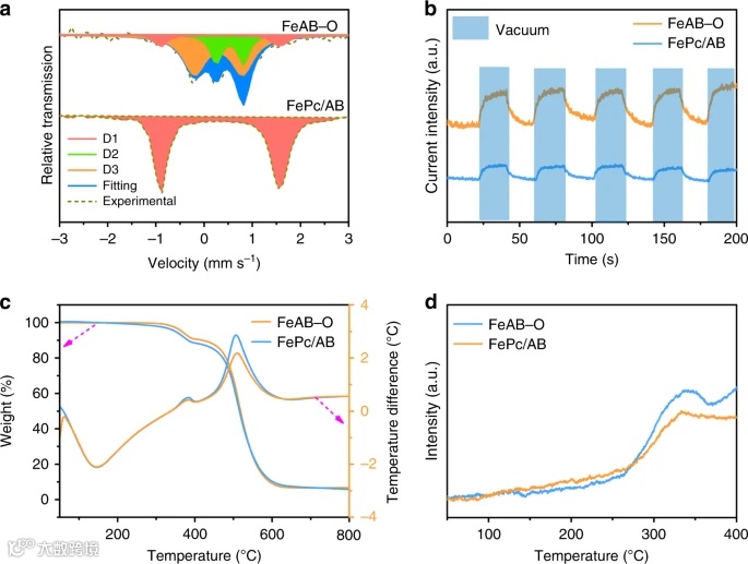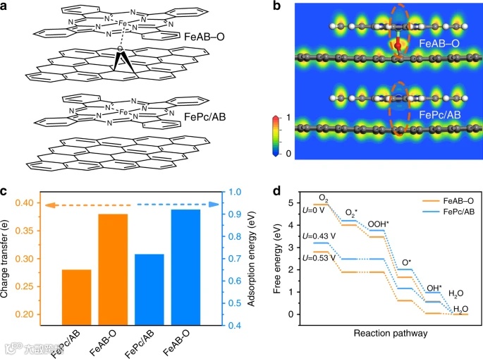 本文通过在O2等离子体处理的乙炔黑(AB-O)基体上,将FePc分子与含氧基团进行配位设计了一种复合催化剂(FeAB-O),实现了对O2的有效吸附和活化。理论计算表明,轴向O配位(O-FeN4)破坏了Fe的电子分布对称性,导致O上的电子局域化,O-FeN4位点上明显的电子局域化有利于O2的轴向吸附和活化。