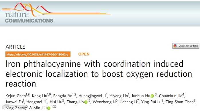 近日,中南大学刘敏课题组在国际顶级期刊Nature Communications (影响因子:12.121) 上发表题为“Iron phthalocyanine with coordination induced electronic localization to boost oxygen reduction reaction”的研究工作。