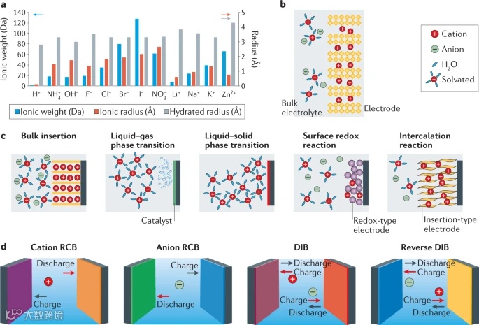 载流子,即溶液中的阴、阳离子,是电池的基本组成部分,决定电池的电化学原理及性能。非金属载流子是水系电池中替代金属离子的一种选择,具有快速动力学、长循环寿命和低制造成本等优势。非金属带电离子不仅可以通过形成共价-离子键而嵌入电极中,而且还可以作为可逆的氧化还原中心进行电荷转移,其性能优于金属带电离子。