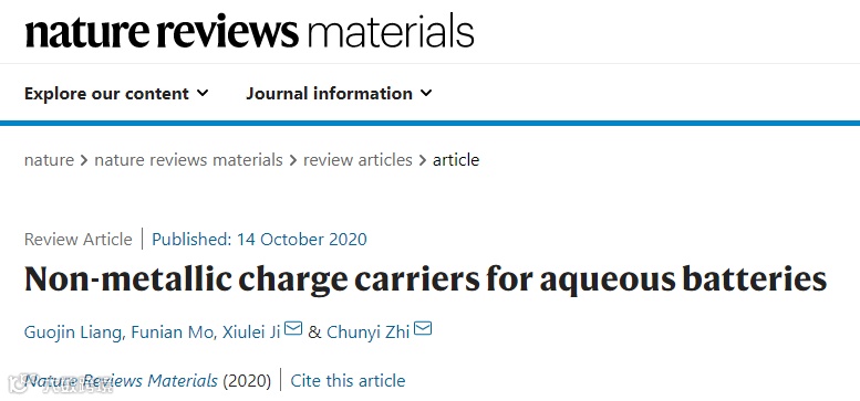 Non-metallic charge carriers for aqueous batteries,Nature Reviews Materials,2020.