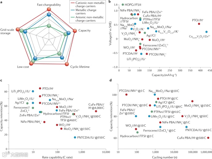 不管设计哪一类电池,均要以电池的输出性能为导向。传统地,金属离子一直被认为是默认的反应载荷,而电极材料和电解质是决定电池性能的关键因素。然而,离子种类也将极大影响电池性能、比容量和能量密度。与金属离子载荷相比,非金属离子载荷具有成本低、可大规模储存、充电速度快、容量大、循环寿命长等特点。由于不同的电极材料会导致不同的性能,在这里作者在同一电极上对带正电荷的非金属离子载荷和金属离子载荷的性能进行了评估: