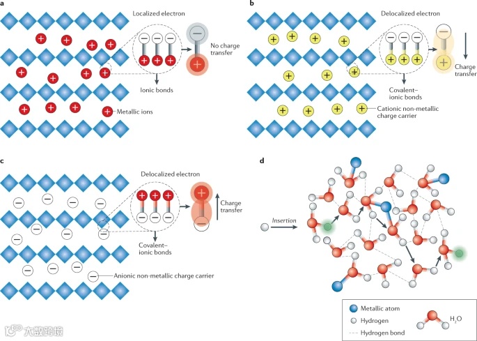 Li+离子是电池系统中最常用的金属载流子,其研究主要集中在充放电过程中电极材料的结构演变。Li+离子通过插入电极材料中的相邻层间或其他未占据的四面体或八面体位置,与结构中其他离子形成离子键。例如,在过渡金属氧化物中,Li+插入后与O原子形成Li-O-M键,其中M为过渡金属离子,如图2a所示。而在以阳离子为穿梭离子的摇椅电池中,非金属离子可以与电极中的带负电荷的原子相互作用,形成杂化共价-离子键,如图2b所示。与纯离子键不同,共价-离子键可通过将电子从主电极框架转移到插入的非金属离子上,使电子离域化,非金属离子可作为一个额外的氧化还原中心。