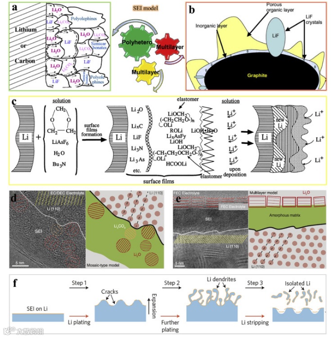 (一)SEI的结构和组成随电解质种类的不同而变化。当前,主要有两种类型的广泛认可的SEI结构。第一种是镶嵌结构,由无机组分和有机组分随机镶嵌而成。第二种是多层结构,由无机内层和有机外层组成。虽然上述模式已为人所知,但其内在SEI的各种化学成分所起的作用尚未得到深入分析,在某些方面仍存在争议。在锂的反复沉积/溶解过程中,自然SEI会变厚、不均匀、易开裂,严重影响锂金属负极的循环稳定性。