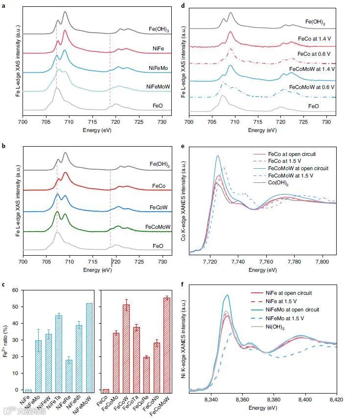 类似的现象也在其他文献被报道,读者有兴趣可自行查找(①10.1038/nchem.2886,②10.1002/adma.201606800,③10.1073/pnas.1620787114)。在本文中,以FeCoX为例进行探讨,通过额外加入高价态金属原子,从而降低Fe、Co的氧化态。XAS谱图表明FeCo中存在大量Fe3+物种,而FeCoX以Fe2+物种为主。在氧化电位下,FeCoMoW样品中Co2+物种被完全氧化到更高的价态,但在FeCo中仍以Co2+物种形式存在。这与上述文献所报道的结果类似,当将施加电位从1.5 V切换到1.2 V后,在FeCoMoW样品中Co的氧化态变为低价(电位更低时,发生Fe3+向Fe2+的转化),而在FeCo样品中没有发生这种情况。