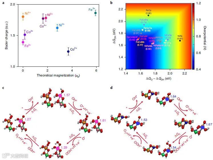 以FeCoOOH作为模型,根据Pourbaix图确定表面端基,通过Bader电荷分析和磁化强度研究金属原子的电子性质的变化趋势。计算研究表明,Co起初表现为~3+价态,在OER电位下发生3+/4+的转化,对应于催化剂表面所发生的OER热力学限制过程(TLP)。通过额外加入高价金属,形成FeCoX(X=Mo、W、Nb、Ta、Re)体系,从而使得Co和Fe呈现较低的荷电状态。图1c得出了FeCoX体系在OER过程中Co原子(粉色圆球)的巴德电荷分析,结果表明在整个OER循环中,Co位点表现出更小的价态变化。图1b所示,与FeCo相比,FeCoX体系可以使OER的过电位达到最低。因此,作者将这种过电位的降低归因于FeCoX体系中Co活性位点的低电子亲和能,有效降低了电子转移所需的能量。