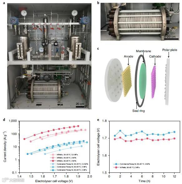 图4 将NiFeMo催化剂应用于工业电解槽:(a-c)电解装置实物图及内部构造;(d)不同工况条件下的极化曲线;(e)在300 mA cm-2下,长时间电解电压的稳定性。