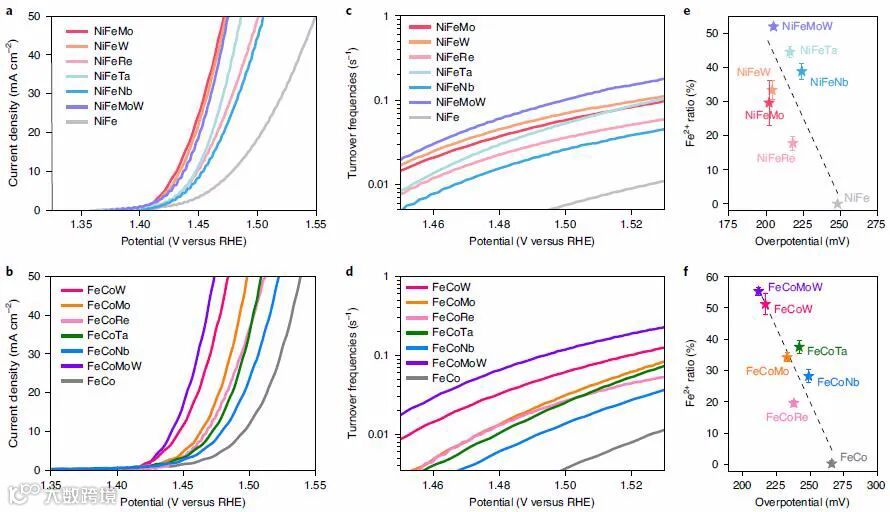 将催化剂的过电位与其Fe2+物种含量的相关性进行探讨,如图3e、f所示,结果表明,在FeCoX中,Fe2+物种含量越高,过电位越低。但这一结论无法完全适用于NiFeX体系中。虽然具有高的Fe2+含量的催化剂能产生较低的过电位,但这种关联并不完美,也有一些例外。因此,为了区分催化剂表面积和内在活性的影响,作者还调查了不同催化剂的周转频率(TOF)。如图3c、d所示,在300 mV过电位下,NiFeMoW、FeCoMoW的TOFs分别比NiFe、FeCo高出约17倍和21倍。