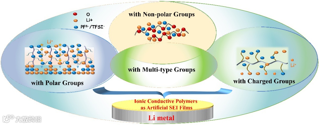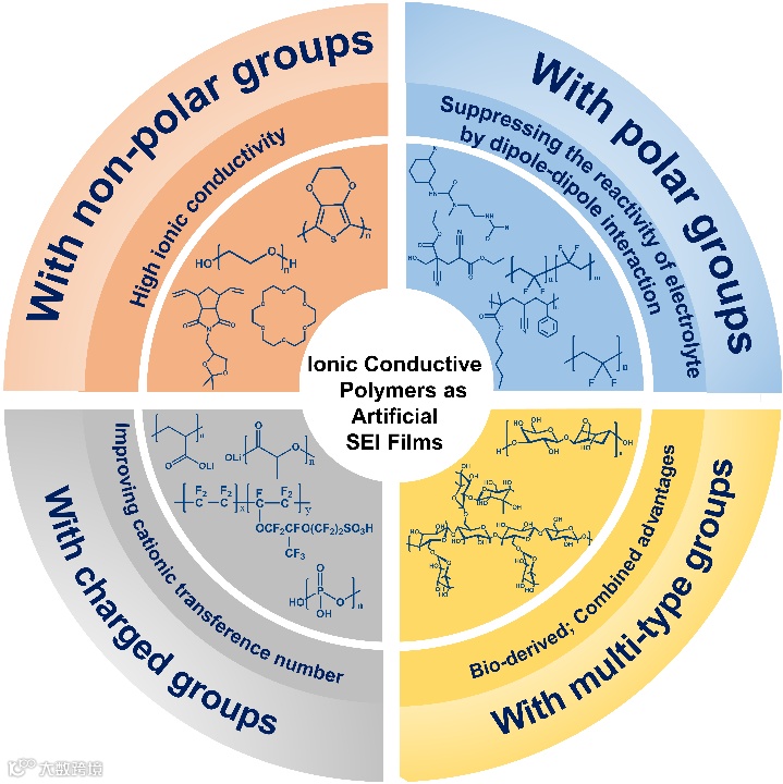 利用导离子聚合物作为人工SEI膜是新兴的研究领域,通过合理的设计,能取得比较理想的电化学性能。本文中,作者总结了离子导电型聚合物作为人工SEI膜的在锂金属电池领域的最新研究进展,重点介绍了近几年相关聚合物在抑制锂枝晶以及稳定锂金属界面方面的代表性工作。
