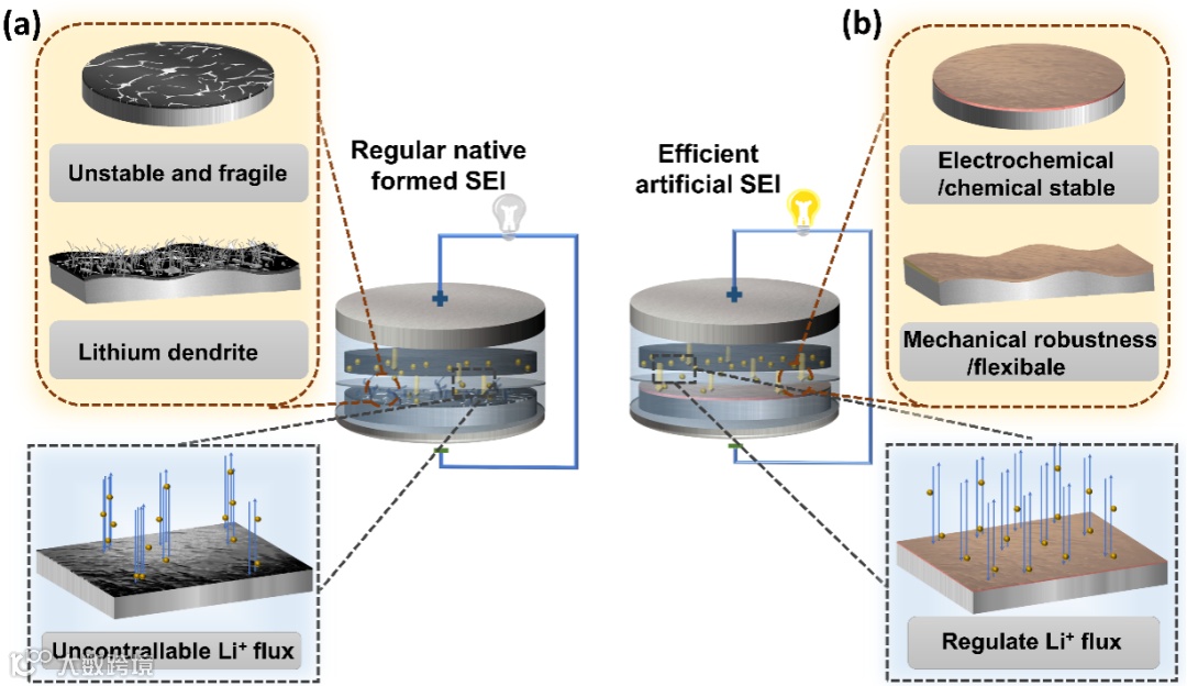 固体电解质界面(SEI)膜在抑制锂枝晶生长和保护电极方面起着重要作用。然而,自然形成的SEI的机械强度低,在锂金属电极的不断变化过程中容易断裂,从而失去其作用。
