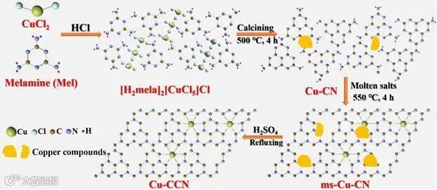 以三聚氰胺和CuCl2为前驱体,采用熔盐法合成Cu-CCN样品的过程示意图及制备样品的相应化学分子结构。