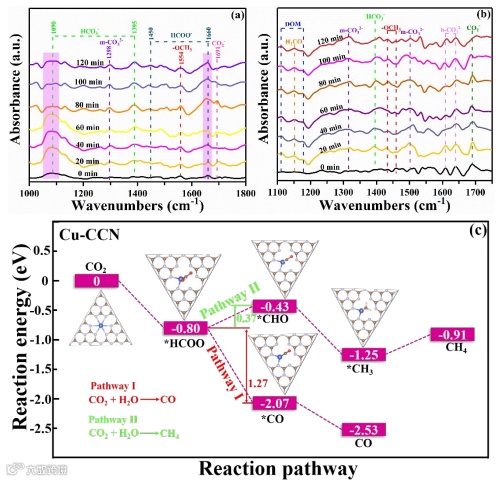(c)基于DFT理论计算的Cu-CCN样品光催化还原CO2的反应途径和相应的化学分子结构。“ *”代表基材上的吸附位点。