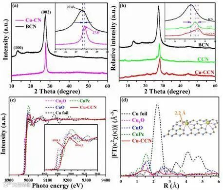 (c)Cu-CCN,CuO,Cu2O,CuPc和Cu箔的归一化XANES光谱和(d)傅里叶变换的EXAFS光谱