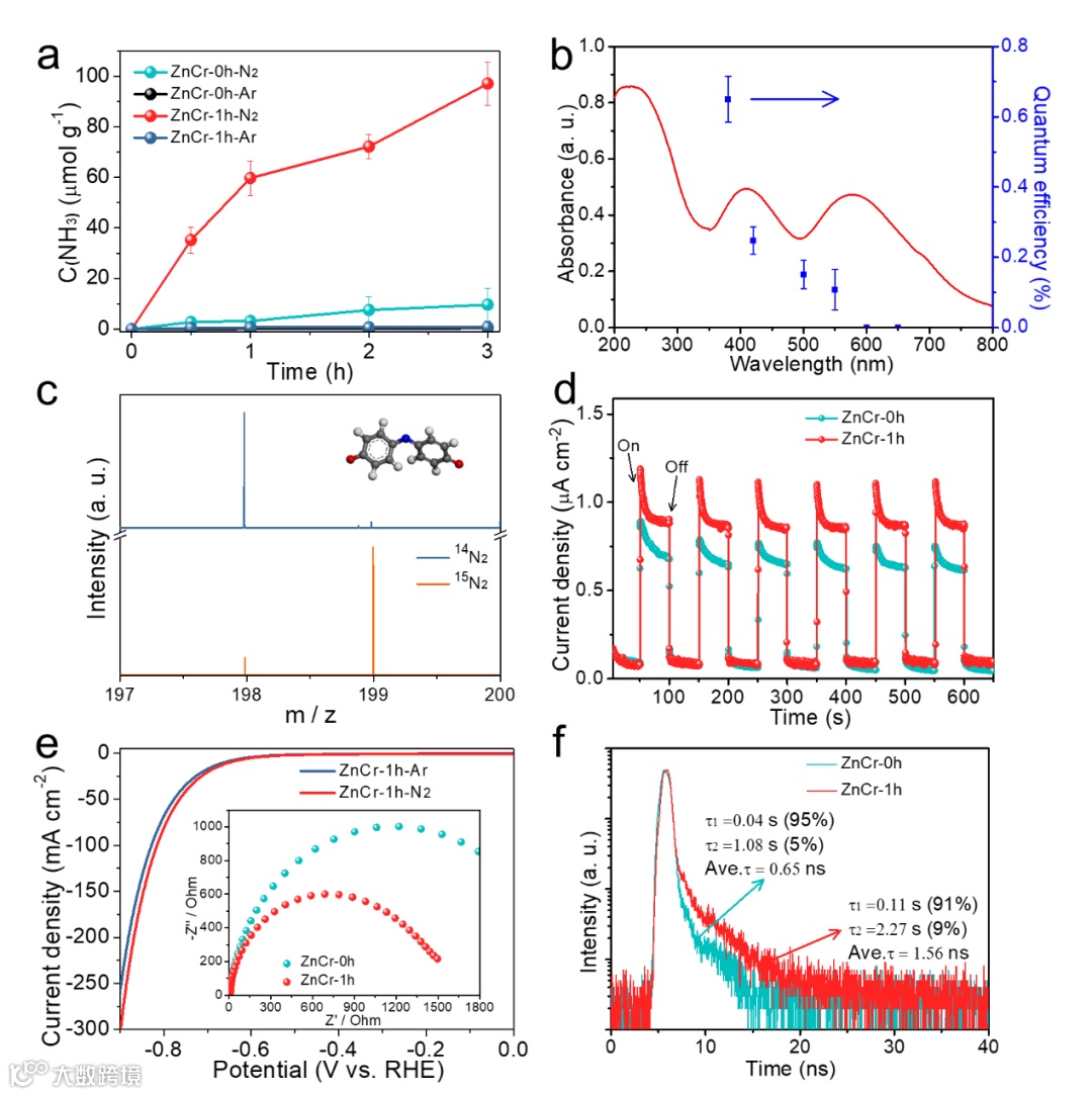 b) 蚀刻ZnCr-1h纳米片上N2光固定的表观量子效率。绘制了蚀刻纳米薄片的吸收光谱以进行比较。