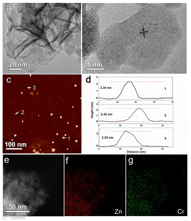 e) 锌和铬的高角度环形暗场扫描TEM图像和f–g) EDS元素图。