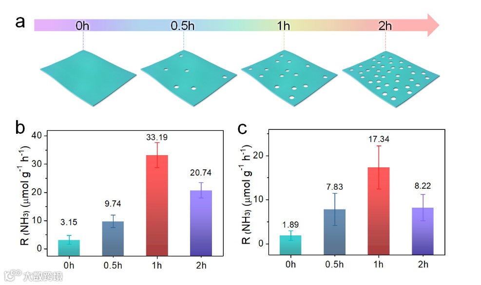 b、 c) 以水为质子源,在UV-vis和可见光照下反应3h后用离子色谱法检测不同ZnCr-LDH样品的氨产率(横坐标时间为每个ZnCr-LDH纳米片样品的碱蚀刻时间)。
