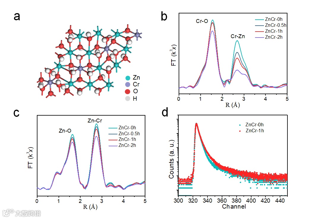 f) ZnCr‐0h和蚀刻ZnCr‐1h纳米片的时间分辨光致发光衰减曲线。