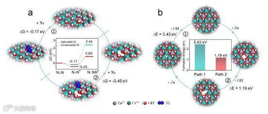 b) 无缺陷ZnCr-LDH和ZnCr-LDH中Vo的形成能。ΔG:吉布斯自由能(白色球体代表H原子,灰色球体代表Zn原子,绿色球体代表Cr原子,红色球体代表O原子)。