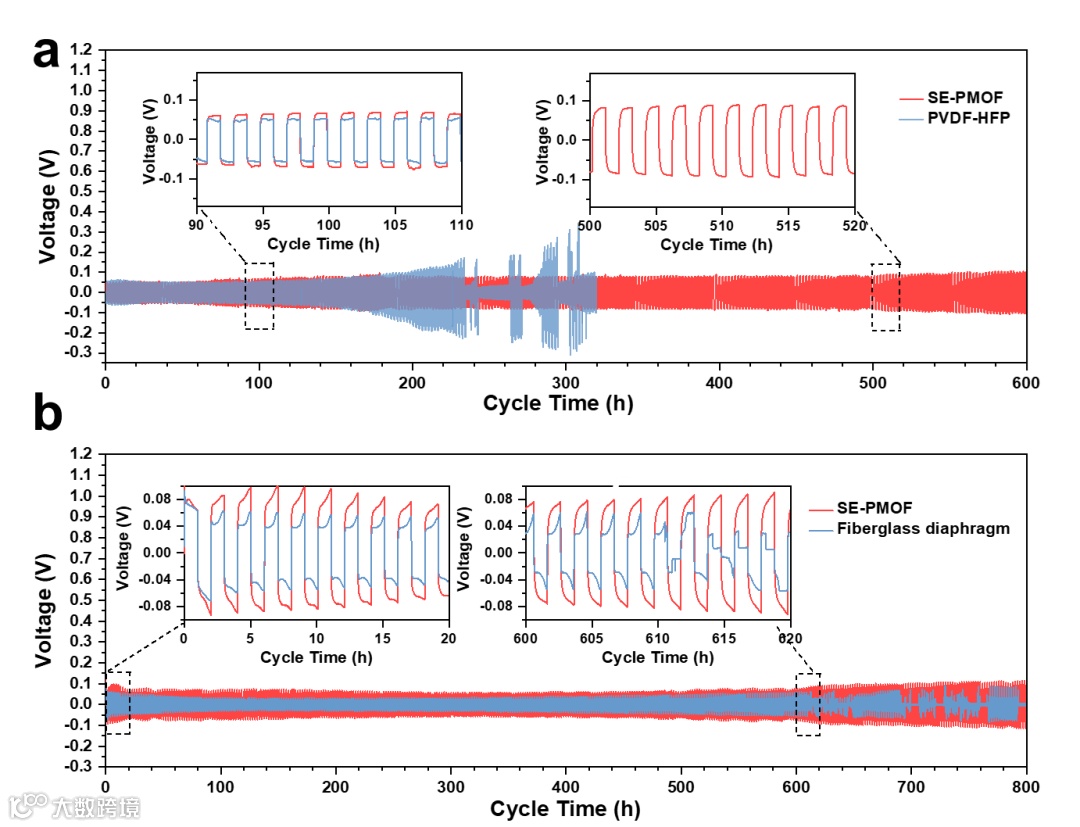 图3. 固态电解质SE-PMOF在对称金属电池中的电镀/剥离试验