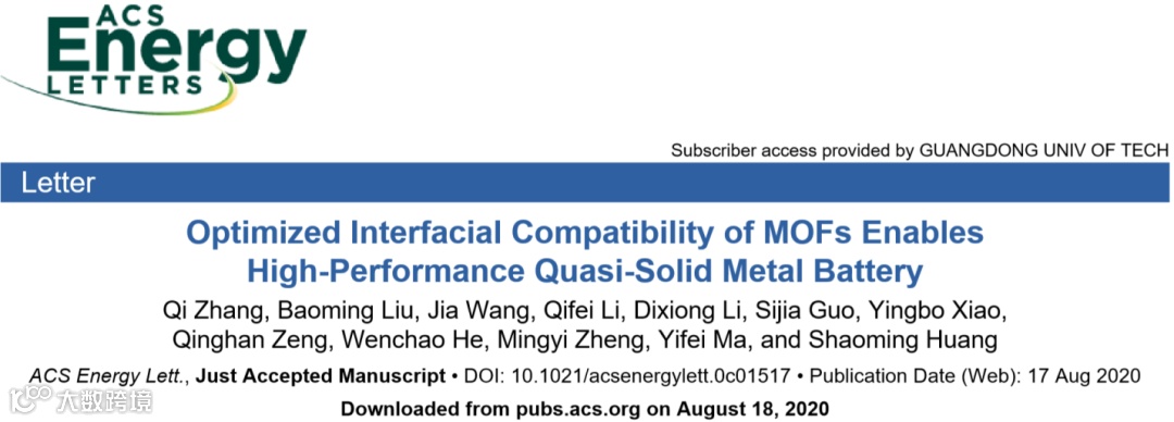 近日,广东工业大学黄少铭教授课题组在国际顶级期刊ACS Energy Letters (影响因子:19.0) 上发表题为“Optimized Interfacial Compatibility of MOFs Enables High-Performance Quasi-Solid Metal Battery”的研究工作。