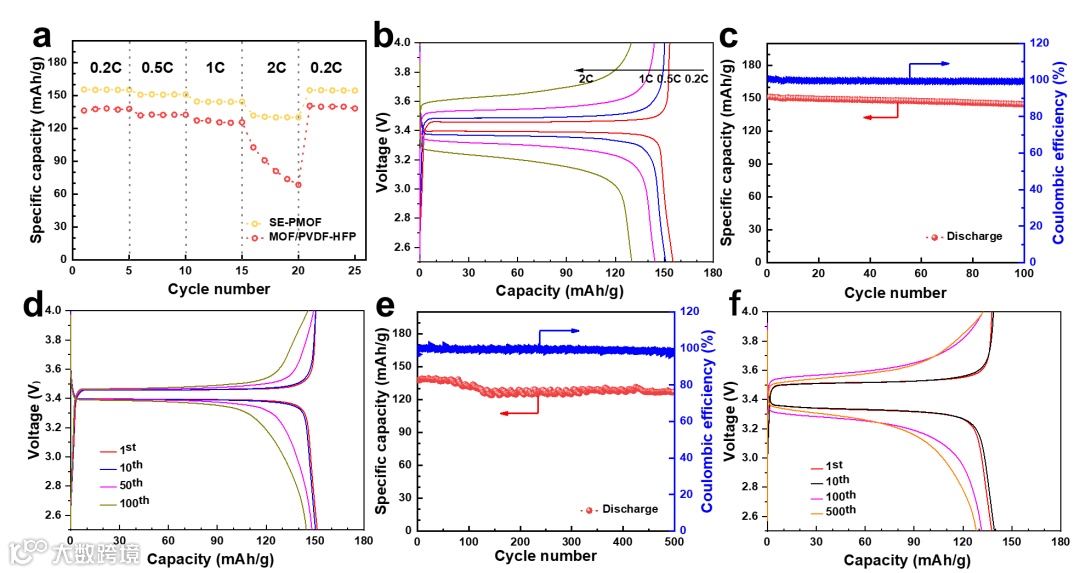 图4. LiFePO4|SE-PMOF|Li电池的倍率性能和循环性能