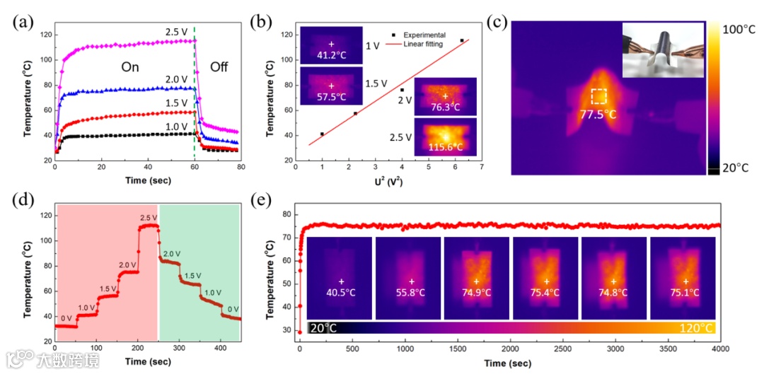 此外,双层结构复合薄膜还表现出优异的快速响应焦耳电发热性能,在2.5V低外施电压下复合薄膜的发热温度可达到115℃,且在空气中长时间发热、反复弯折等条件下都保持良好的电发热稳定性。此项工作为柔性高强多功能电磁屏蔽复合材料的设计开发提供了一种简便高效的方法,所得柔性高强多功能电磁屏蔽复合材料在航空航天、军事工程、人工智能和柔性可穿戴电子设备等领域具有良好的应用潜力。