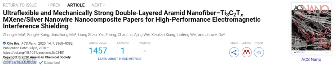 近日,陕西科技大学马忠雷副教授联合西北工业大学顾军渭教授在国际TOP期刊ACS Nano(影响因子:14.588)上发表题为“Ultraflexible and Mechanically Strong Double-Layered Aramid Nanofiber-Ti3C2Tx MXene/Silver Nanowire Nanocomposite Papers for High-Performance Electromagnetic Interference Shielding”的研究工作。