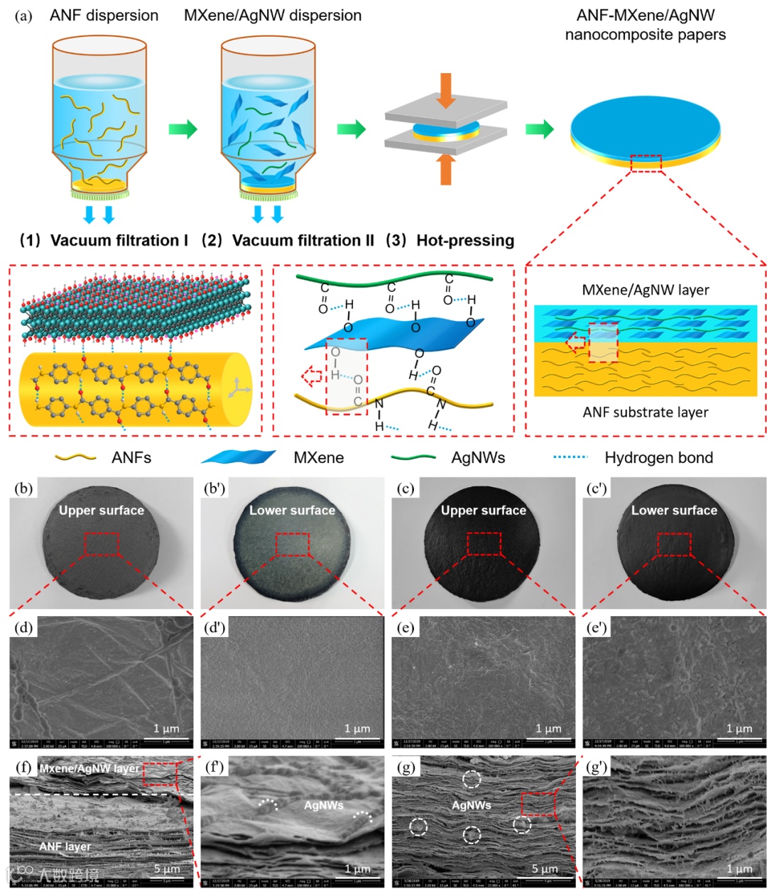图1 双层结构ANF-MXene/AgNW复合电磁屏蔽薄膜的制备与微观结构。