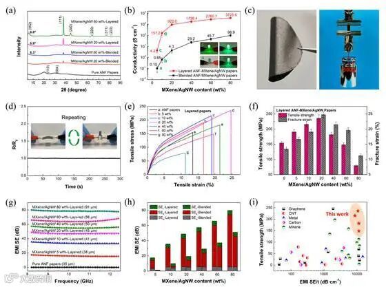 图3 双层结构ANF-MXene/AgNW电磁屏蔽复合薄膜的宏观性能。
