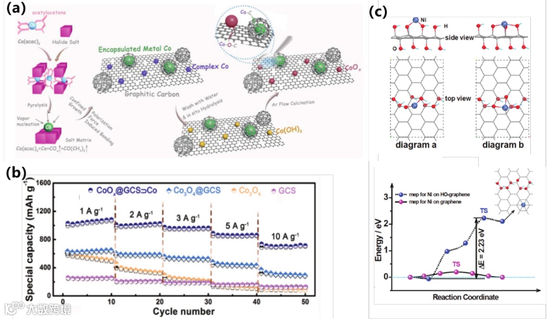 同样,在能量转换体系电极材料的设计方面同样存在该问题。进行金属基-碳基复合材料的界面设计成为了目前研究的难点。界面化学键是指在金属元素与碳元素之间,通过杂元素(N, O, S)引入,使得多种元素的最外层电子达到公用,进而形成界面共价键,在两相之间建“大桥”。由于界面桥键将会诱导材料的能带间隙与电子云密度的改变,来改变电极材料的理化性质。