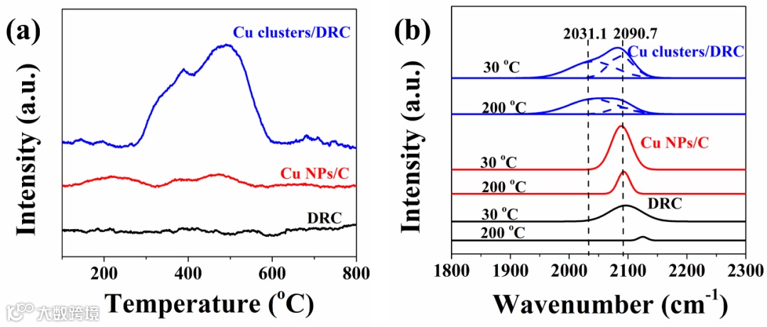 (图3b)Cu clusters/DRC样品吸附CO的红外谱图显示了一个不对称且宽泛的峰,可进一步拟合成两个峰,峰位置分别为2031.1和2090.7 cm-1。将温度从室温升高到200 °C,峰位置为2090.7 cm-1的峰几乎消失了,但是峰位置为2031.1 cm-1的峰却仍然完好的保留,表明峰位置为2090.7 和2031.1 cm-1的峰分别对应于弱物理和强化学吸附CO。