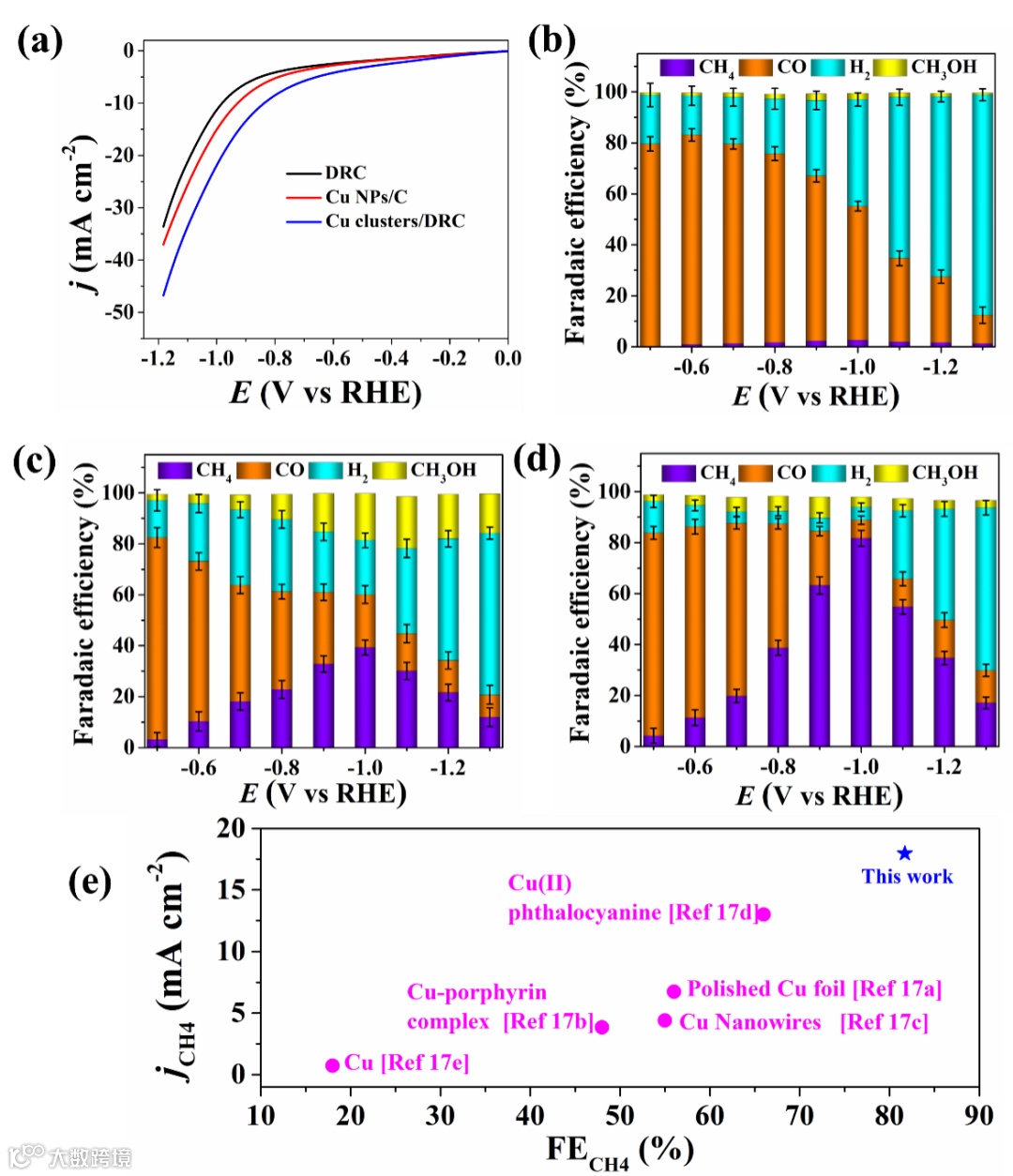 值得注意的是,Cu clusters/DRC的FECH4也高于其他文献报道的铜基催化剂。(图2e)考虑到不含铜物种的DRC几乎不产出CH4,我们可以推断出生成CH4的活性位点为铜。